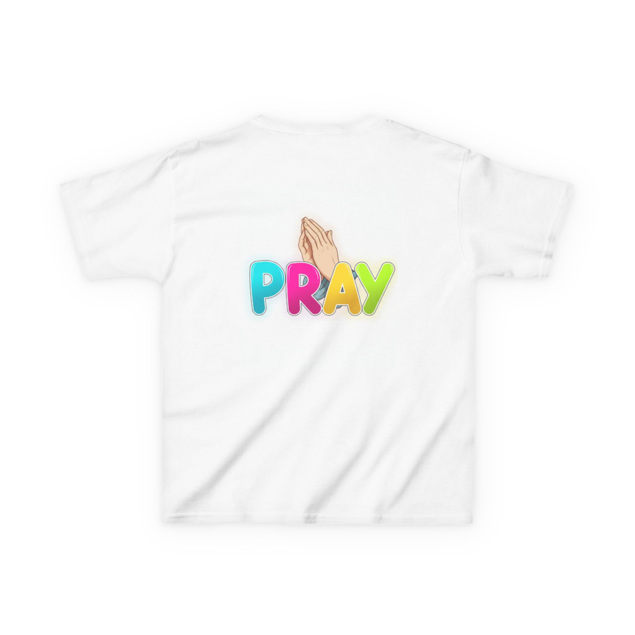 Kids Tee — Colorful “PRAY” Design with Praying Hands — Religious Children’s Tee