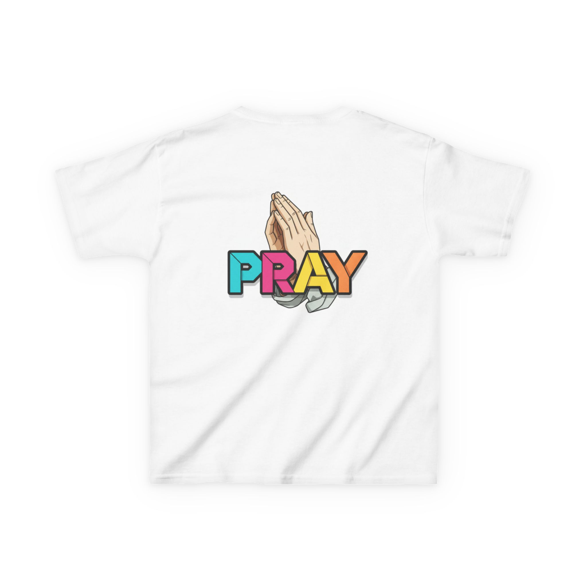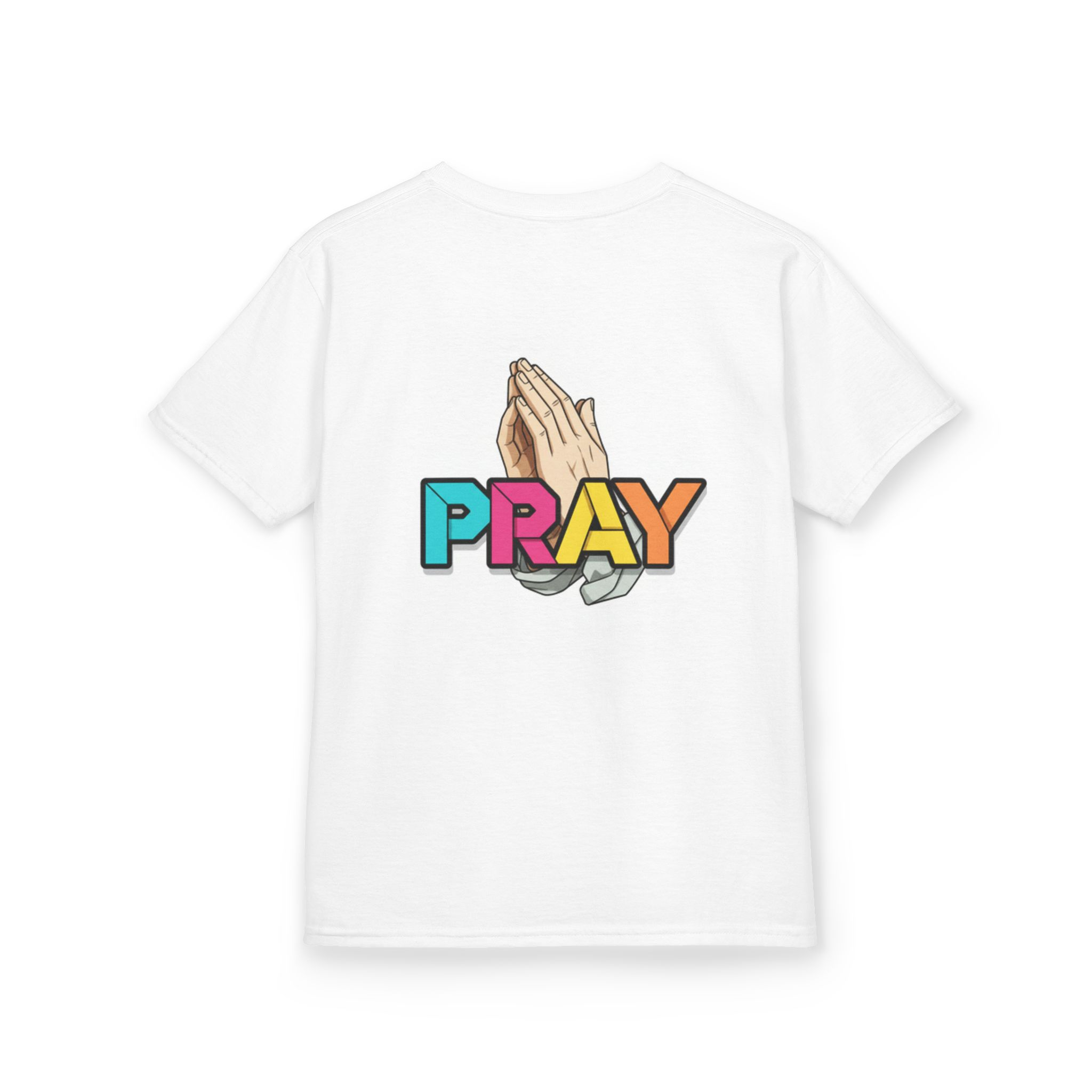 Soft, midweight cotton tee designed for kids who love bright, heartfelt messages. This clean white shirt features a small chest graphic and a bold back print: colorful, block letters that spell PRAY beside a pair of gentle, folded hands. The imagery blends playful color with a reverent tone — lively without being loud — so it sits naturally alongside everyday play clothes or a church outfit. The crew neckline and classic cut let children move freely, while the breathable US-grown cotton keeps them comfortable through playtime, naps, and family gatherings. Thoughtfully made with tear-away labels and stable shoulder tape, this tee feels gentle on sensitive skin and holds its shape wash after wash.
