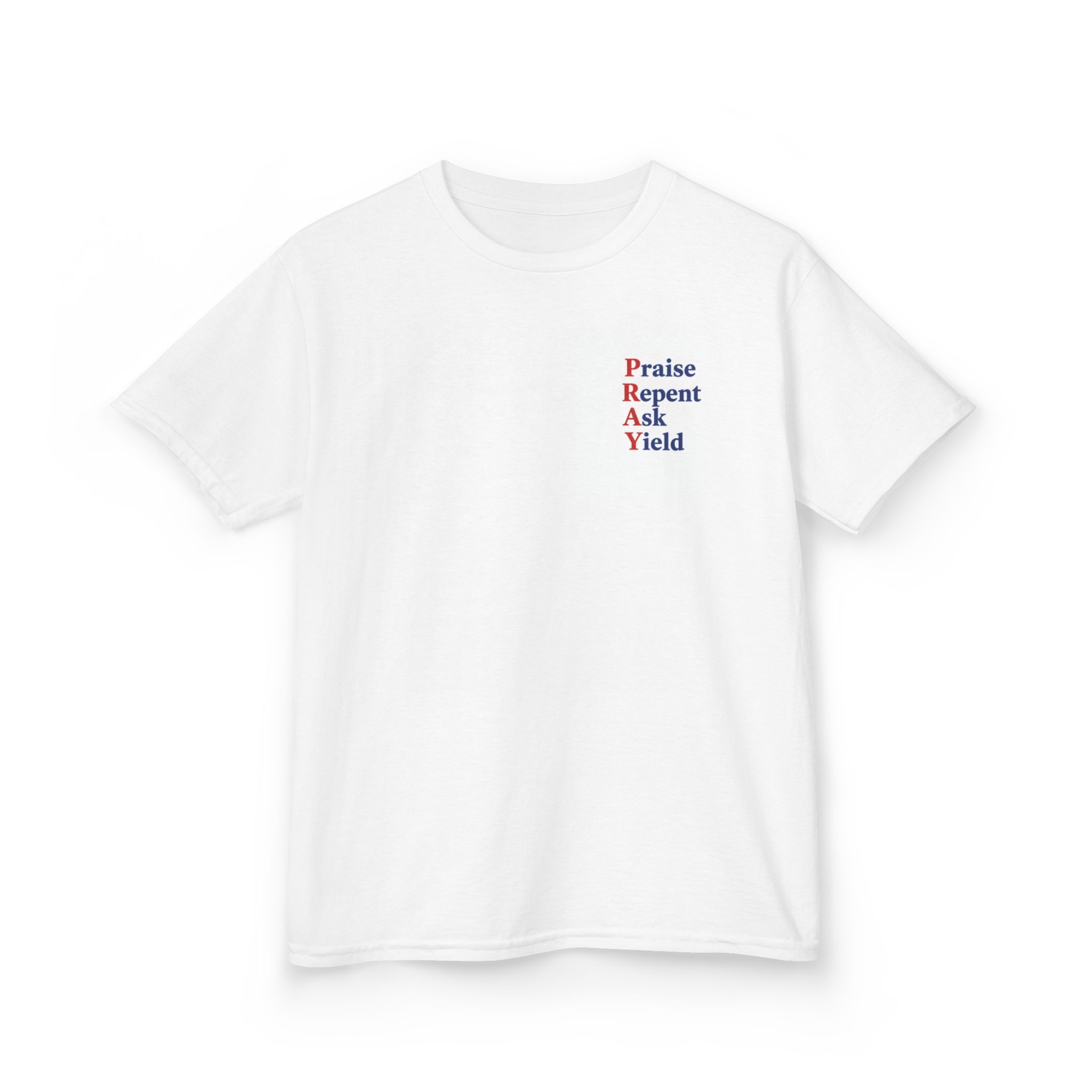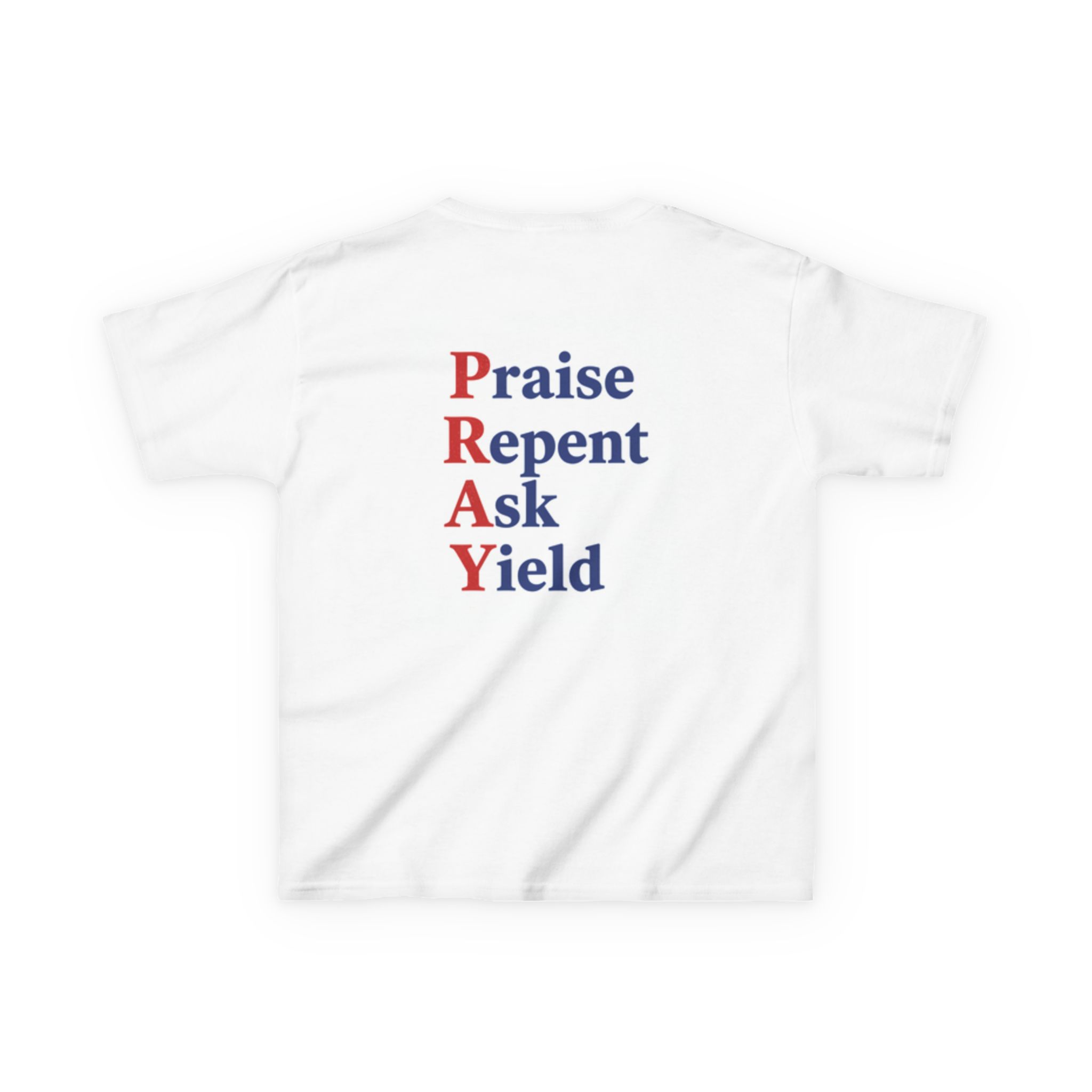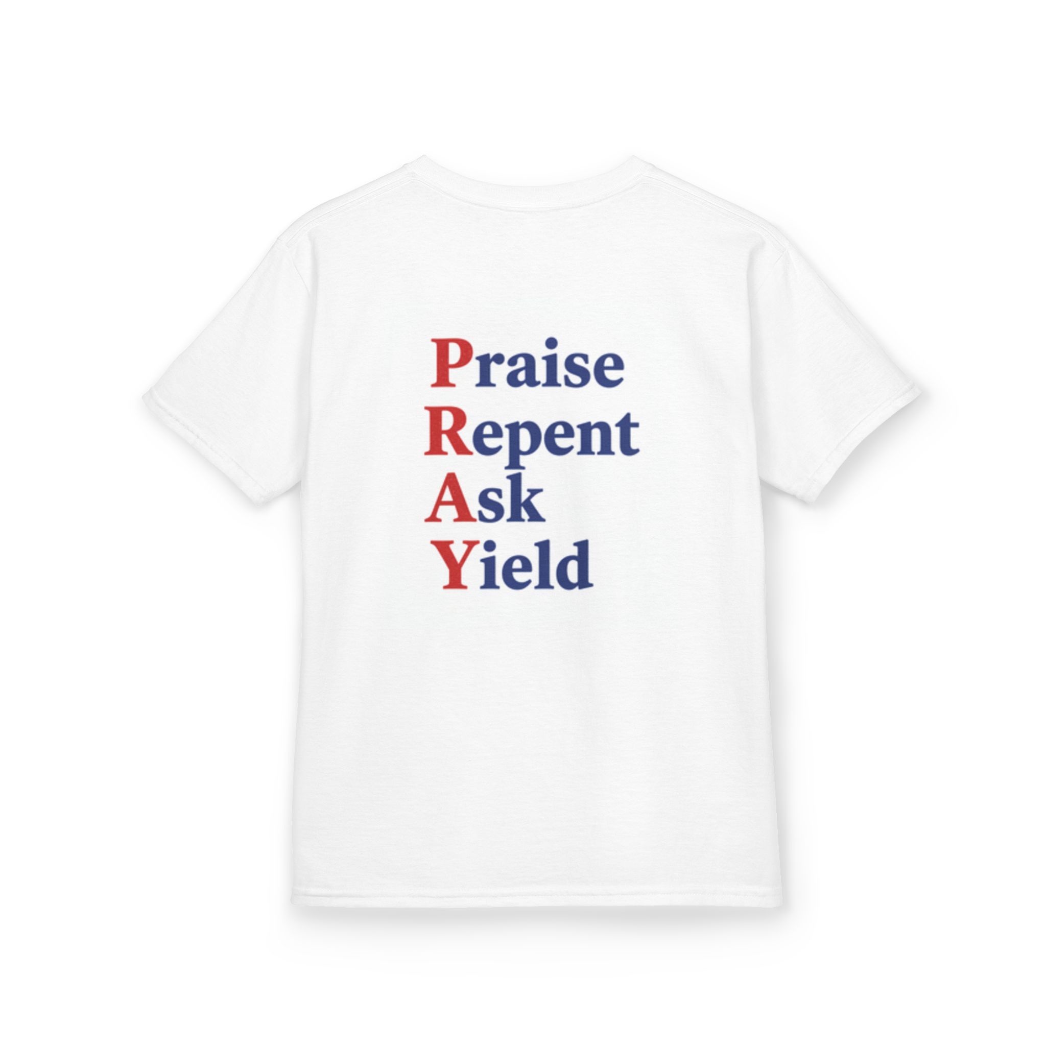 Soft, simple, and quietly bold — this kids tee carries a gentle message your little one can wear with confidence. Lightweight midweight cotton keeps it comfy through play, prayer time, and everything in between. A small, colorful chest print and a larger stacked back design spell out P-R-A-Y with short, meaningful verbs: Praise, Repent, Ask, Yield. The layout feels like a tiny reminder rather than a sermon, so it sits naturally in everyday life — at church activities, family gatherings, or casual days at home. Durable ribbed collar and taped shoulders hold up to active kids and repeated washes. Ethically-sourced cotton and Oeko-Tex certification give parents peace of mind while the tear-away label keeps necks scratch-free.